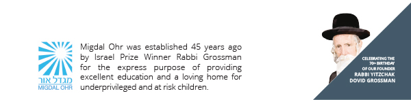 The Sefer Torah itself will be written in honor of Rabbi Yitzchak Dovid Grossman's 70th birthday. The funds raised will go towards building a new Children's Residence, offering a nurturing home for these children at 'Migdal Ohr'. |